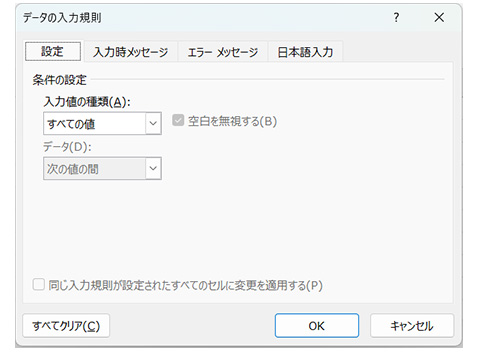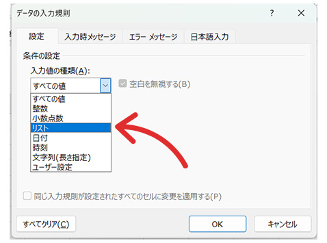 - 「元の値」に、リスト化したセル範囲を指定(例: